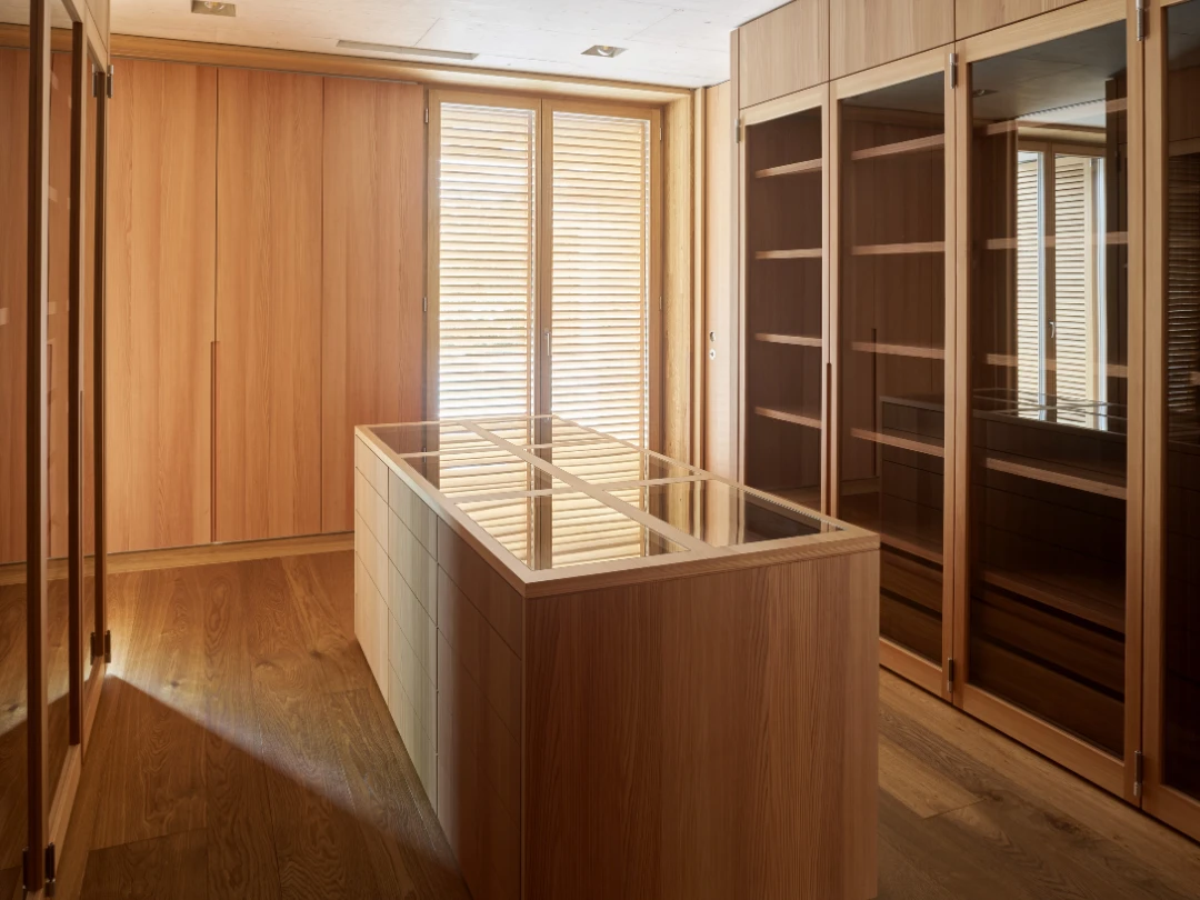 Mit viel Gespür für Details wurden originelle Lösungen umgesetzt, etwa ein altes Hoftor als Tür zum Schlafzimmer. Nach dem Motto «Weniger ist mehr» kamen bewusst wenige Materialien zum Einsatz, sichtbar bei der Wendeltreppe und der zurückhaltend gestalteten Garderobe. Die helle offene Küche erfüllt den Wunsch nach einer modernen Raumwirkung.