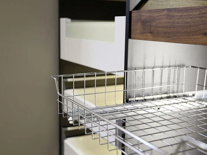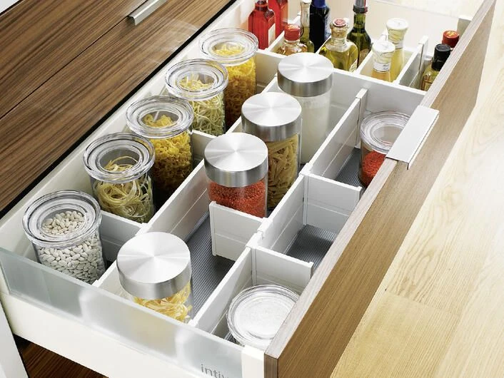 Gitter, Halterungen, Schubladeneinsätze, Trennstäbe oder Tellerstapel sorgen in jeder Schublade und jedem Schrank für Ordnung. Inhalte geraten nicht durcheinander oder in ungewollte Schieflage. Durch cleveres Zubehör kann Platz gespart werden, indem jeder Inhalt seinen fixen Standort hat.