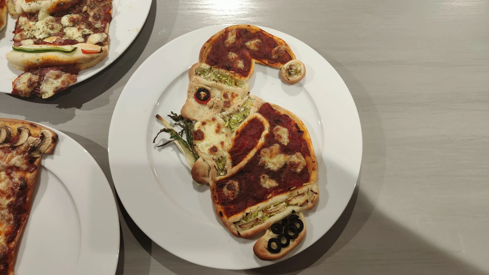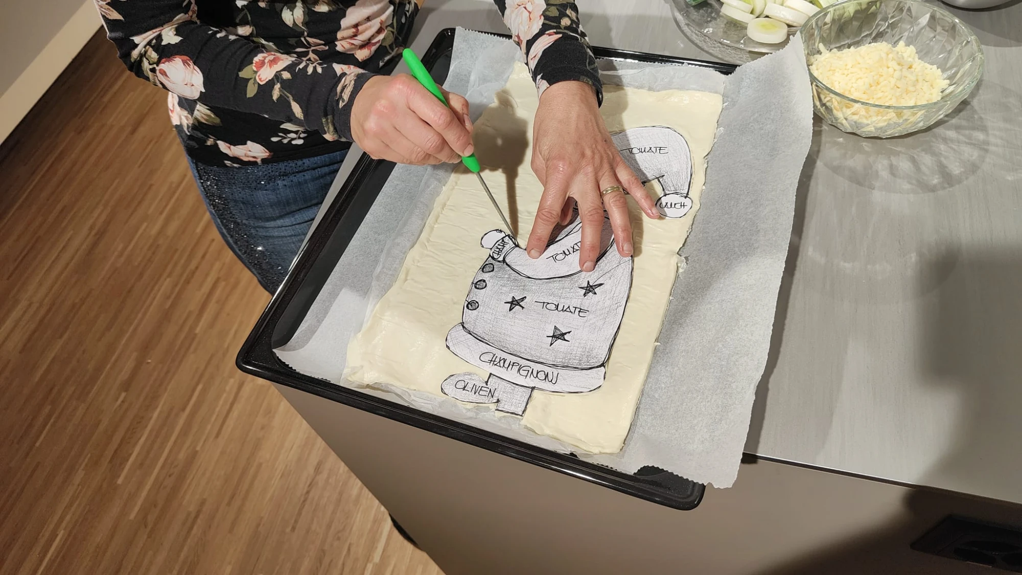 Pizzateig möglichst kalt mit einem scharfen Messer nach Vorlage ausschneiden.