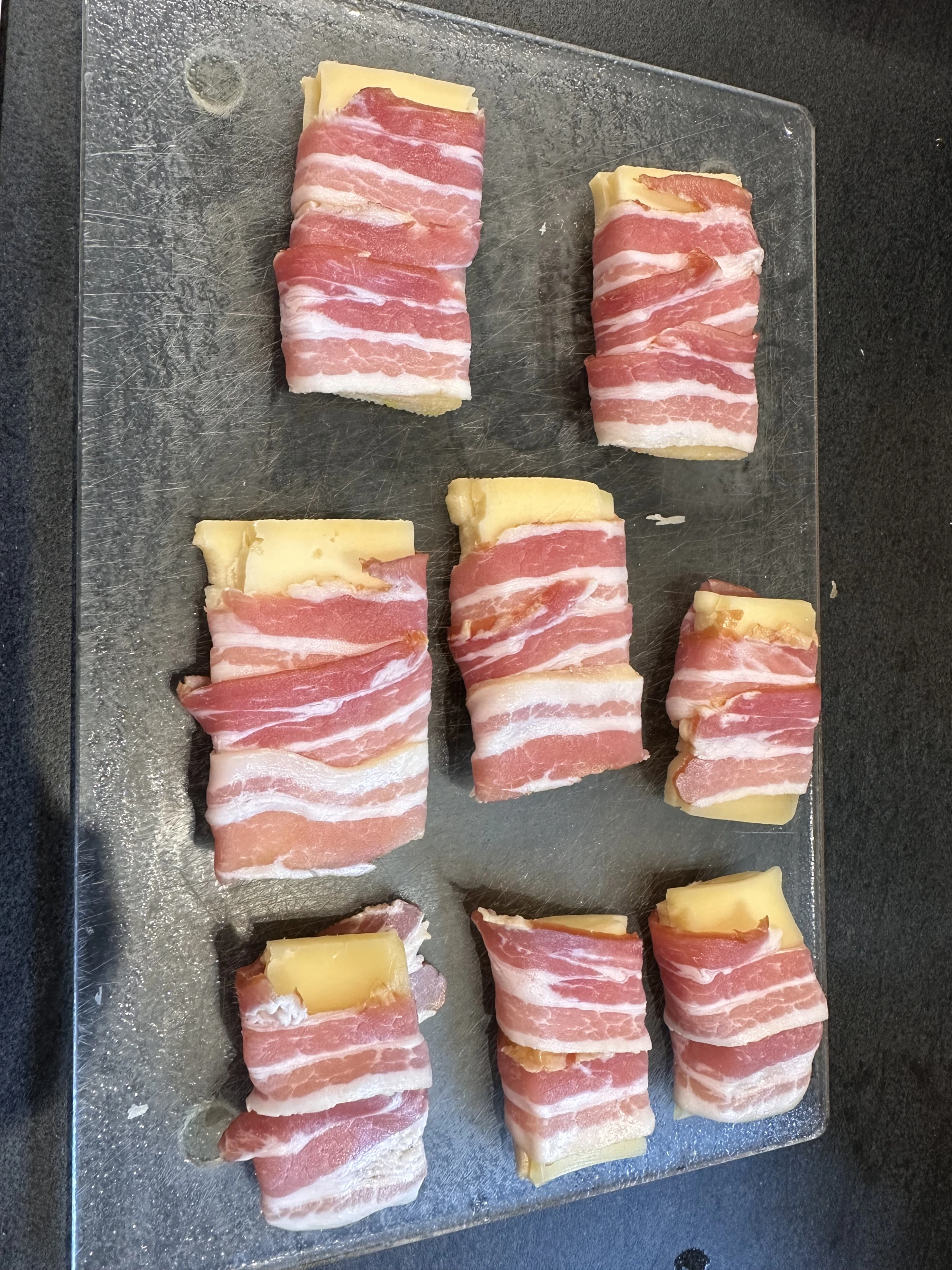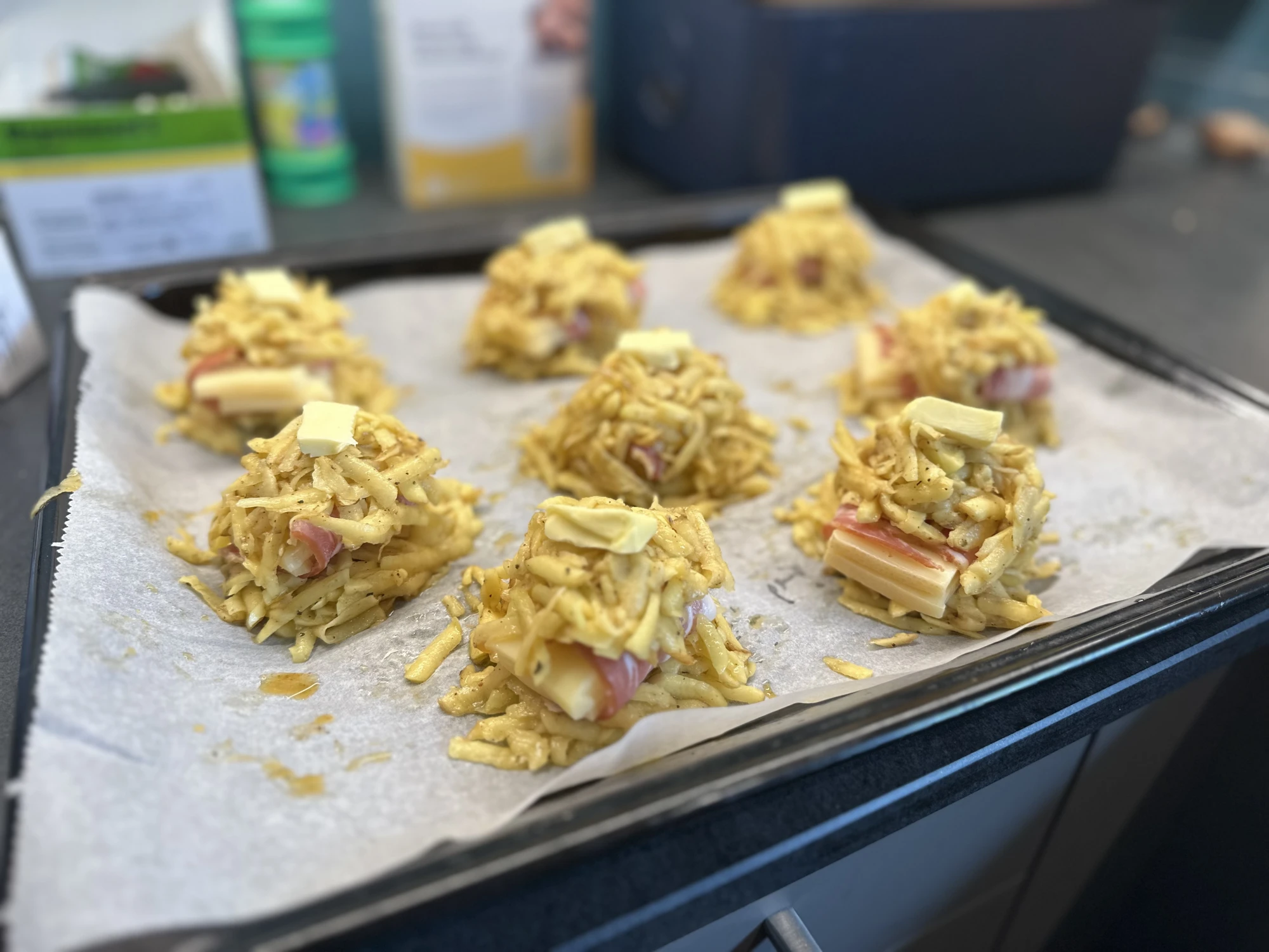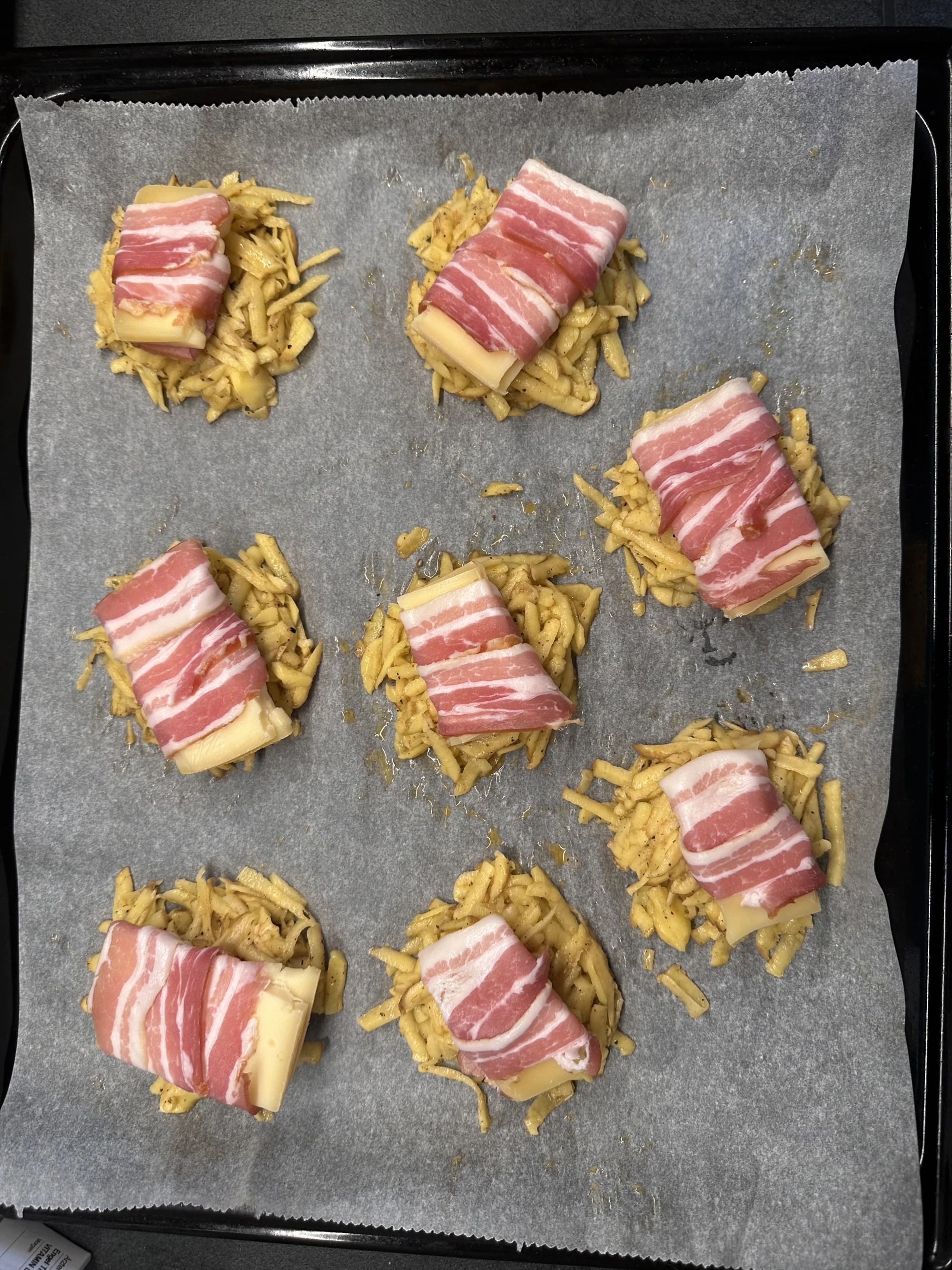 Raclettekäse halbieren, anschliessend je 2 Stücke mit einer Tranche Speck einwickeln und auf die Plätzchen verteilen. Mit der restlichen Kartoffelmasse bedecken und gut andrücken.