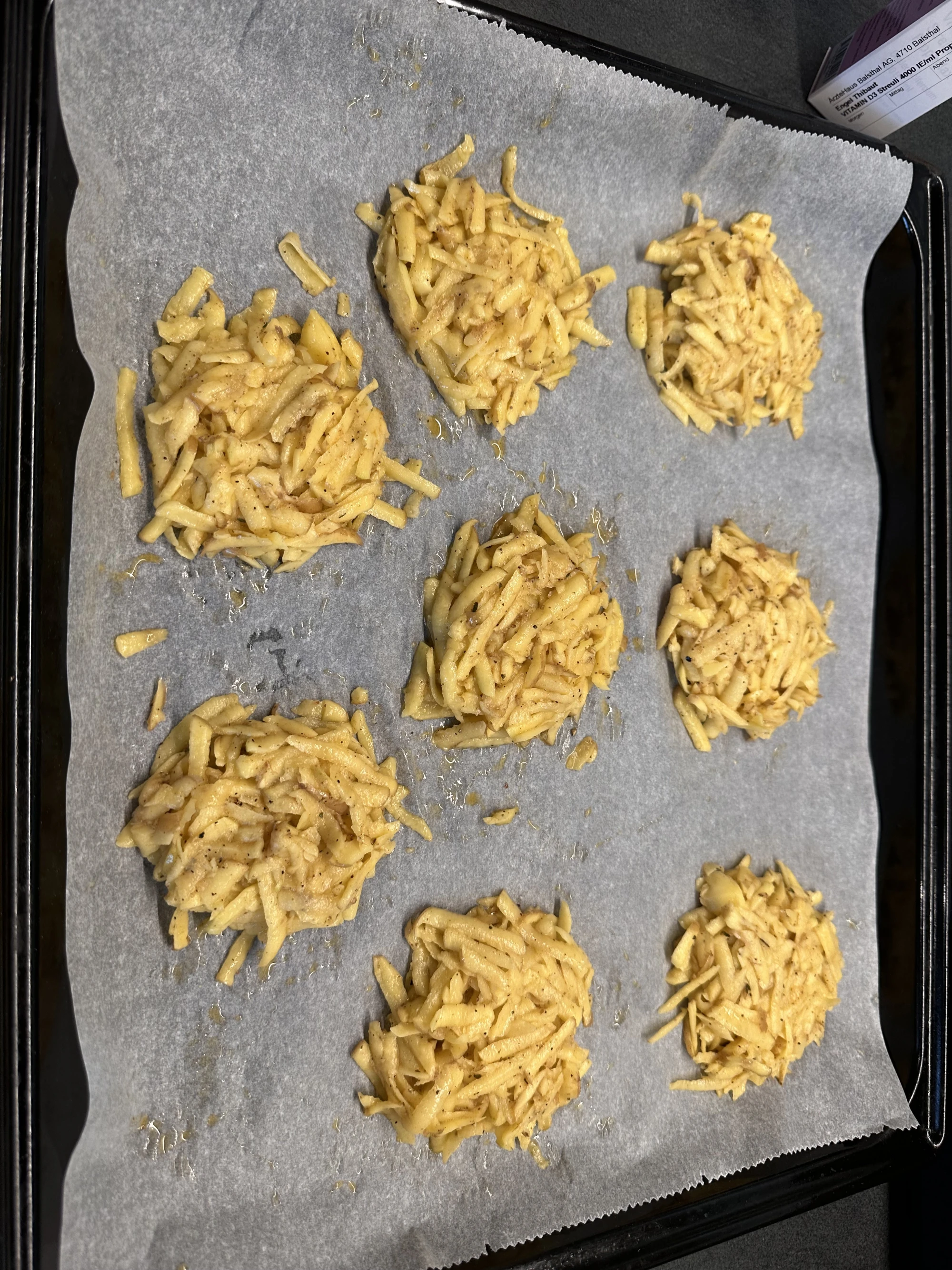 Aus der Hälfte der Kartoffelmasse mit einem Löffel auf dem mit Backpapier belegten Backblech 10 – 12 gleichgrosse Plätzchen formen.