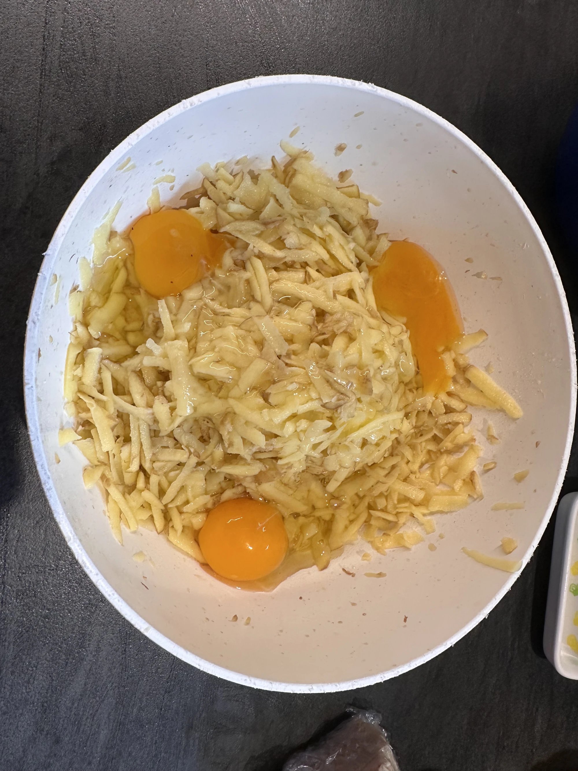 Kartoffeln an der Röstiraffel raffeln, mit den Eiern zusammen in einer Schüssel gut mischen und würzen.