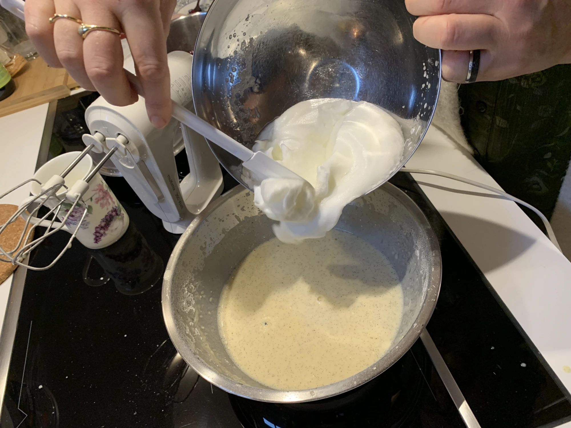 2 Eiweiss steif schlagen und unter die Masse ziehen.