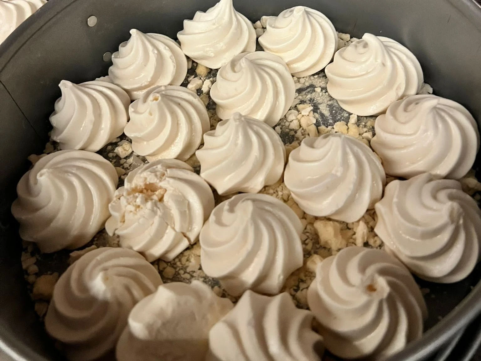 Packung Meringue auf Springbodenform verteilen und zerkrümeln.