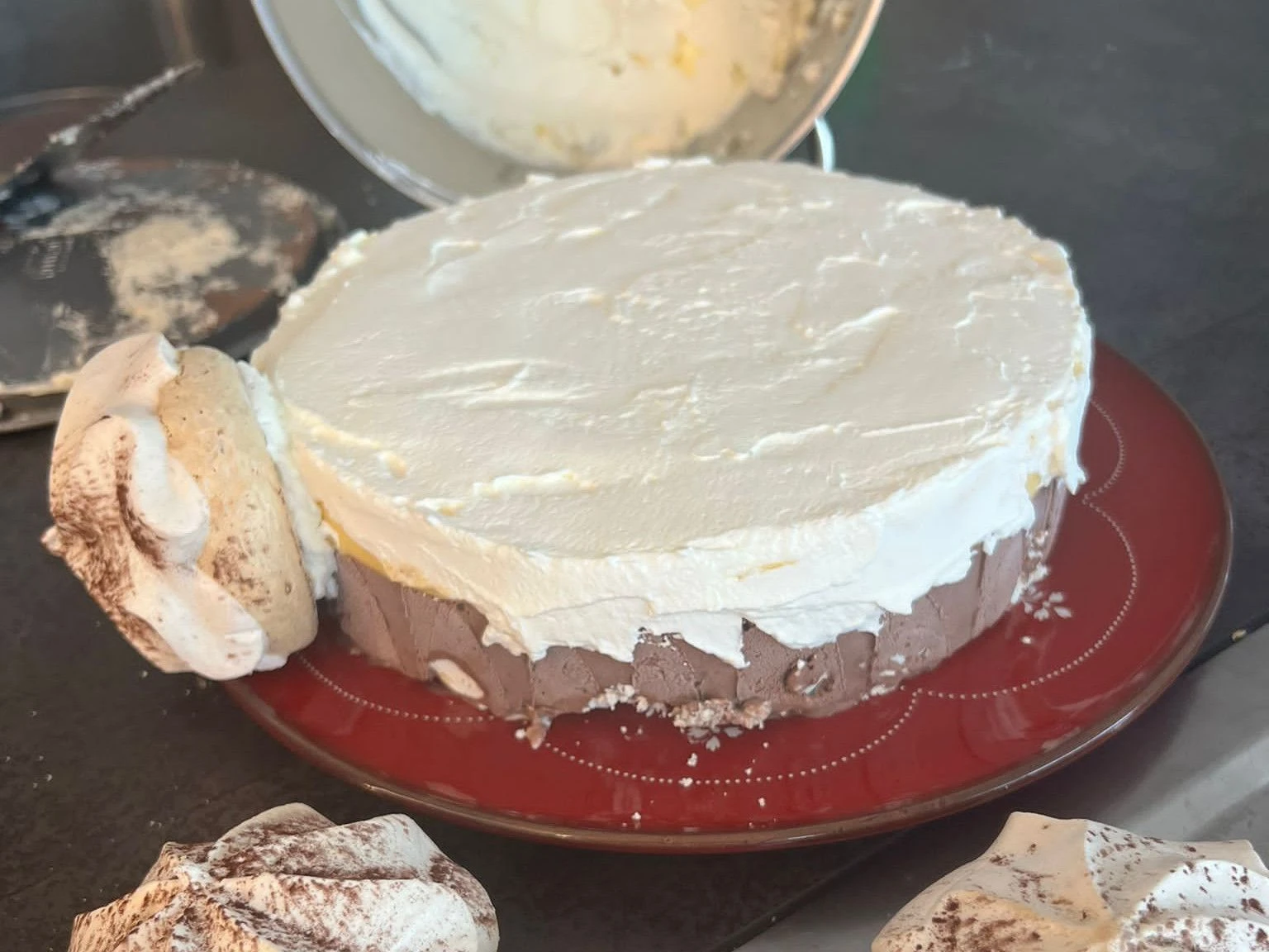 Auf dem Meringueboden verteilen, gefrieren lassen. ( mind. 1h)