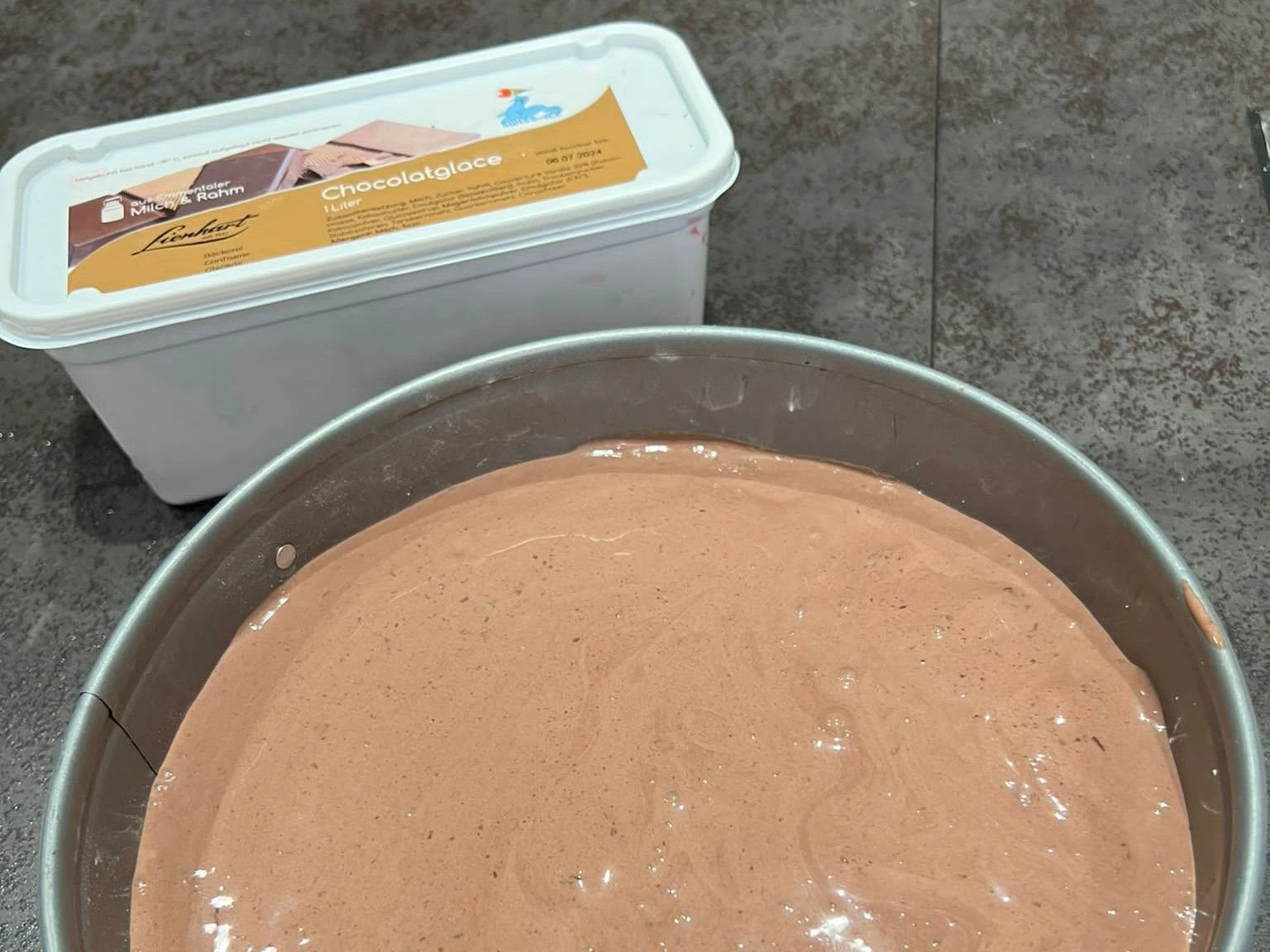 Schokoladeglace auftauen, nach ca. 40 Minuten im Mixer kurz rühren, damit die Masse die gleiche Konsistenz hat.