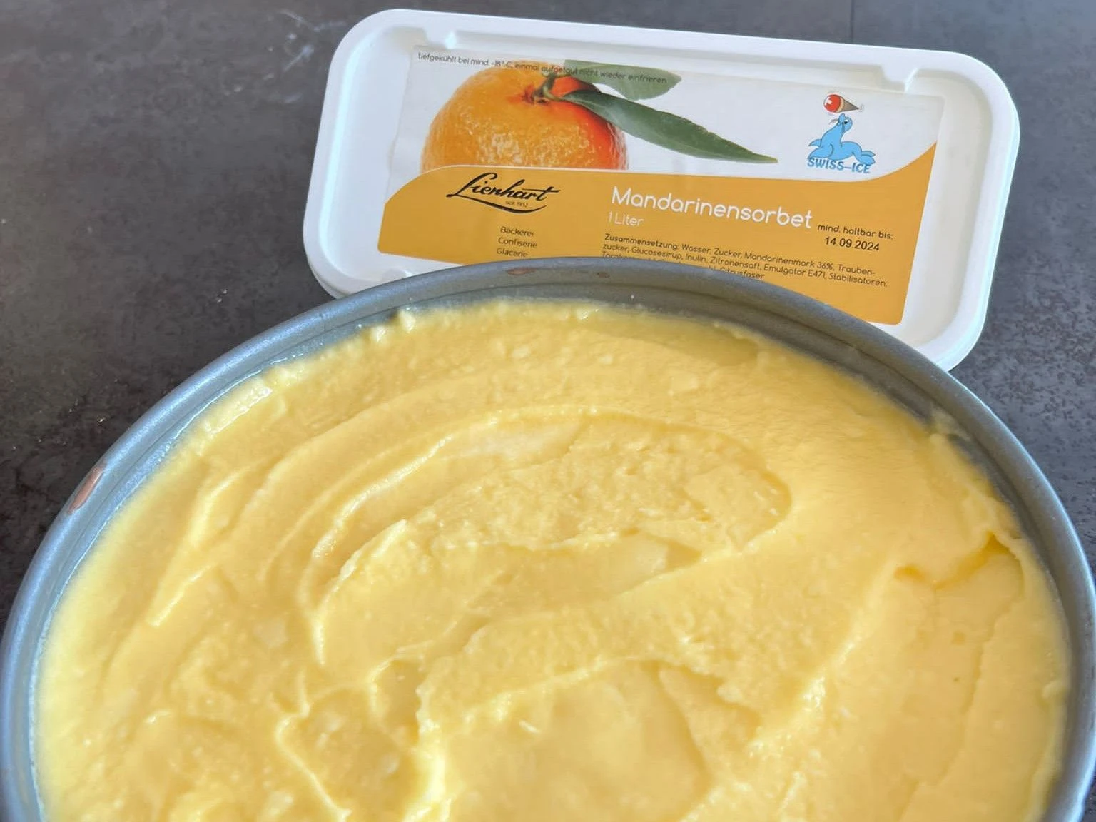 Mandarinensorbet ebenfalls auftauen, mixen und auf der gefrorenen Schokoladenglace verteilen. Wieder gefrieren lassen.