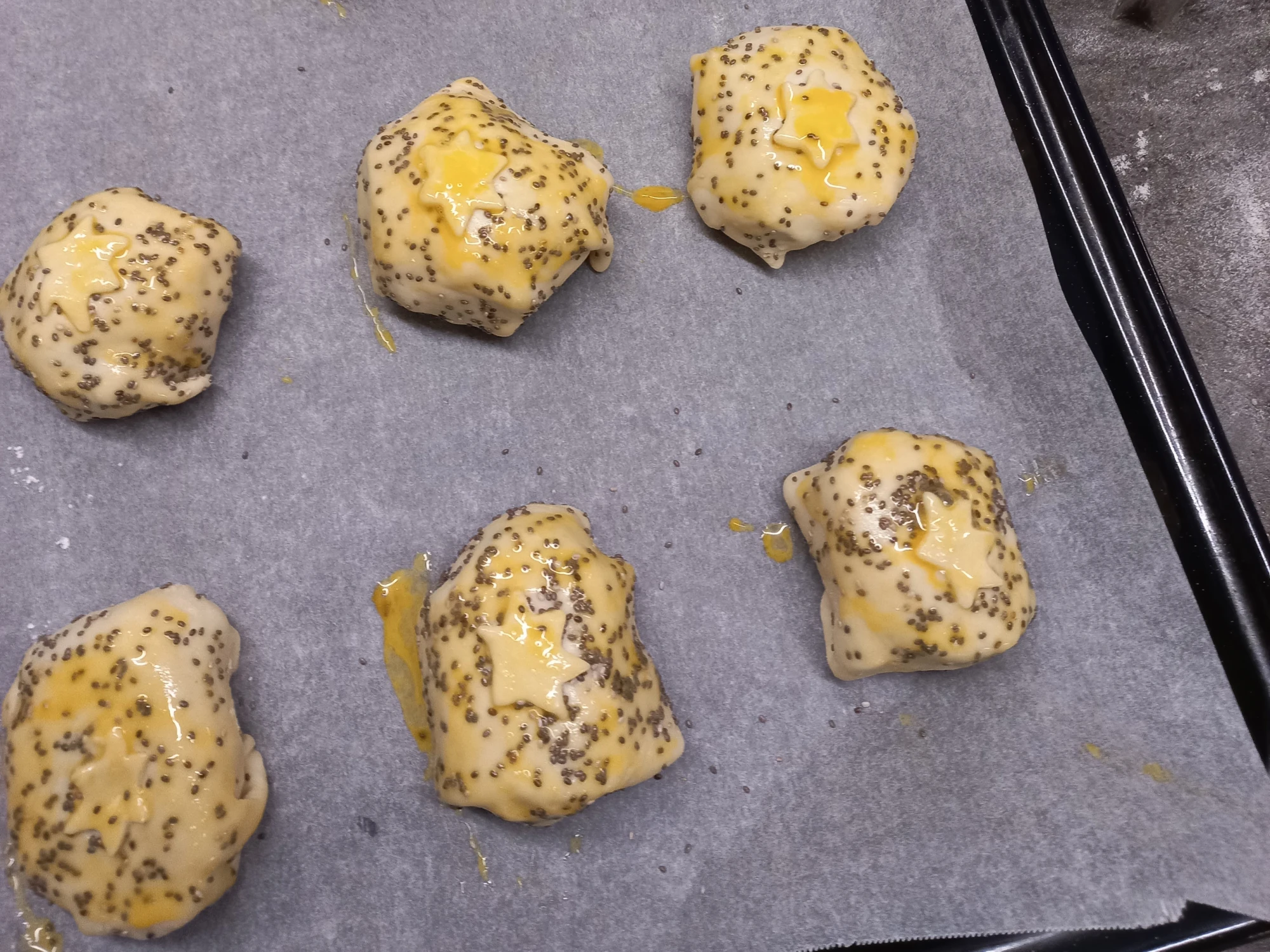 Päckli mit dem Verschluss auf ein, mit Backpapier belegtes Blech legen und vor dem Backen mit Ei bepinseln.