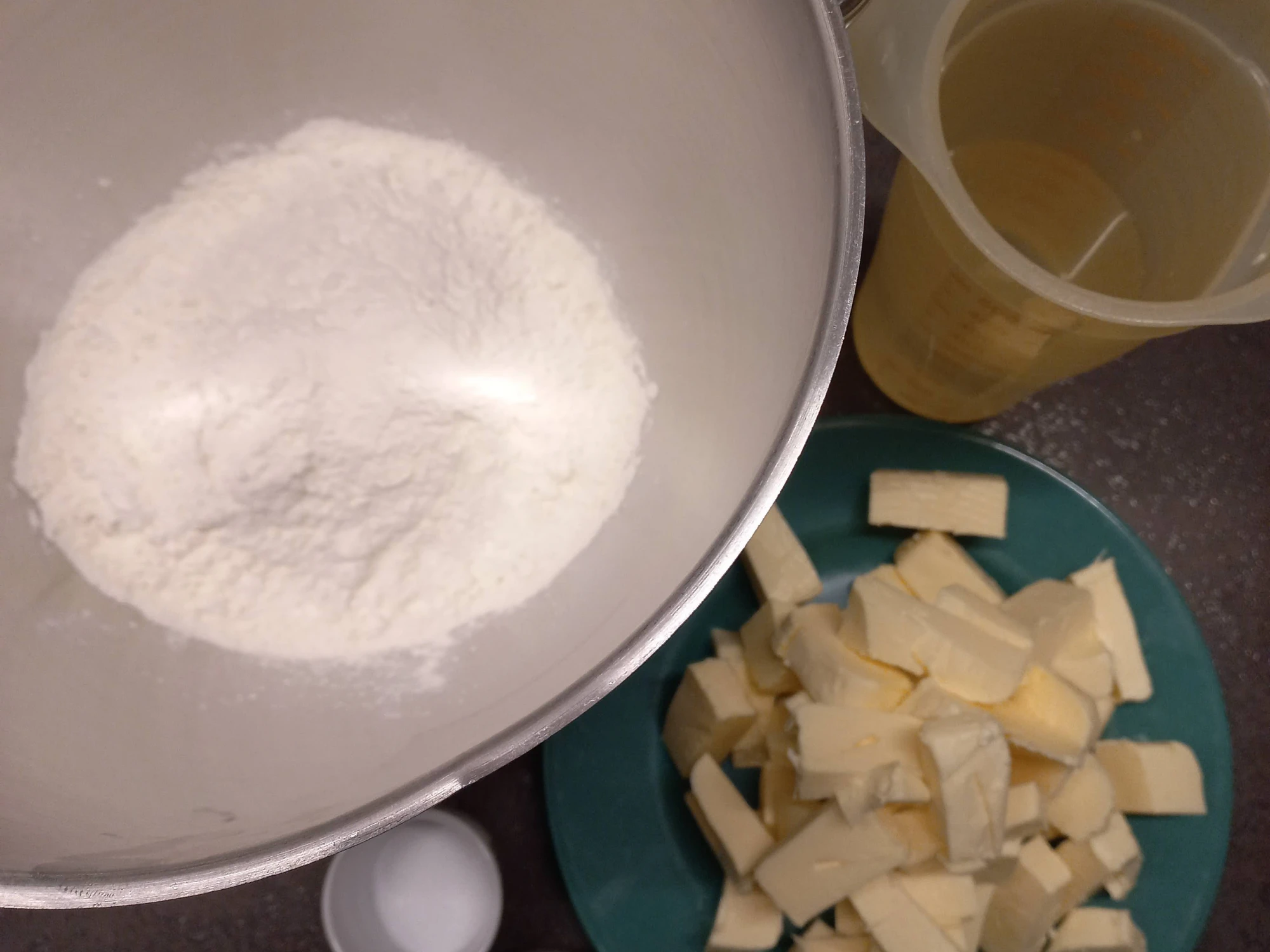 Im Wasser Salz und Zucker vollständig auflösen. Butter in Würfel schneiden und zum Mehl geben.