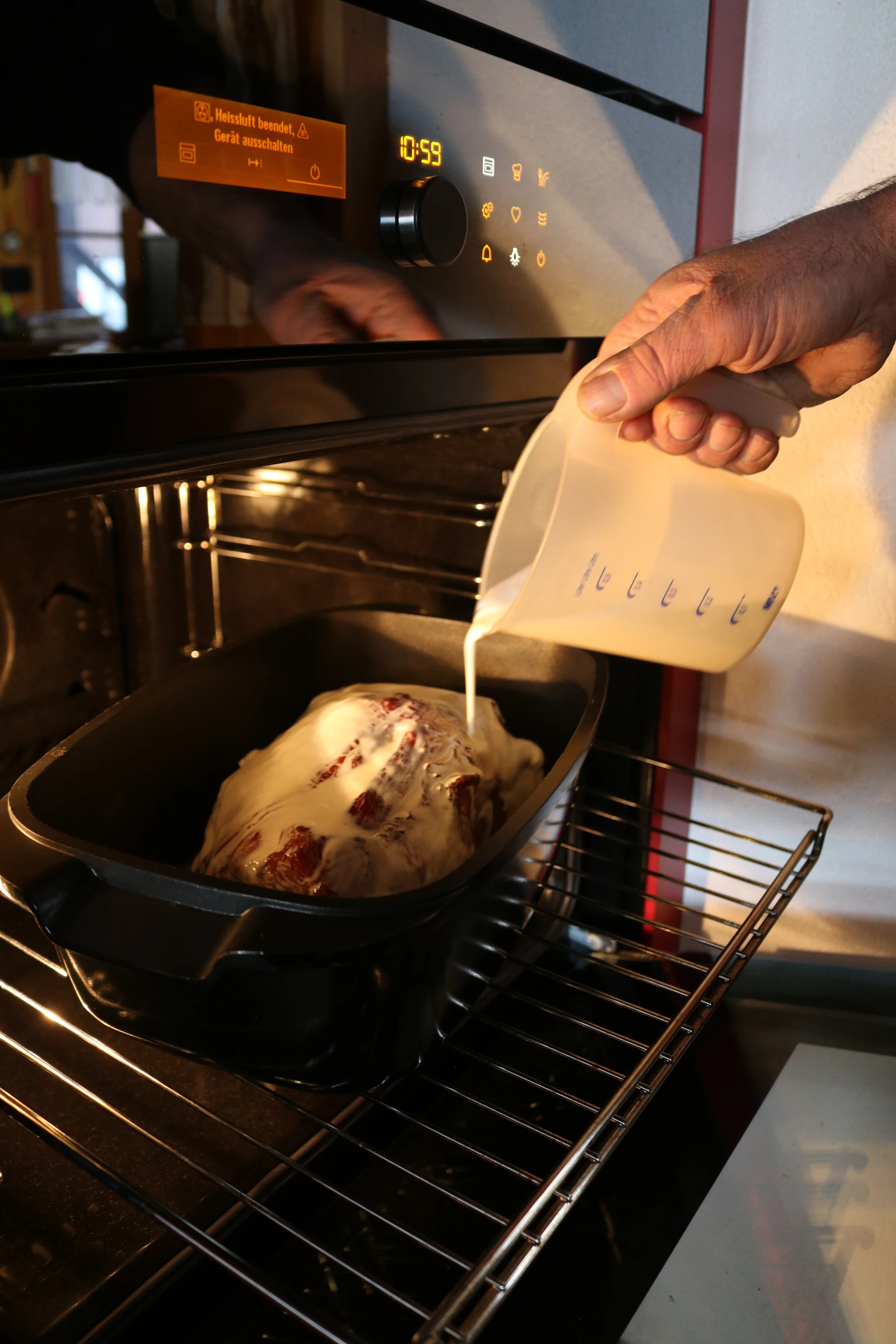 Rahm nach weiteren 15 Minuten beigeben. Braten zugedeckt 50 Minuten schmoren. Von Zeit zu Zeit mit der Flüssigkeit übergiessen.