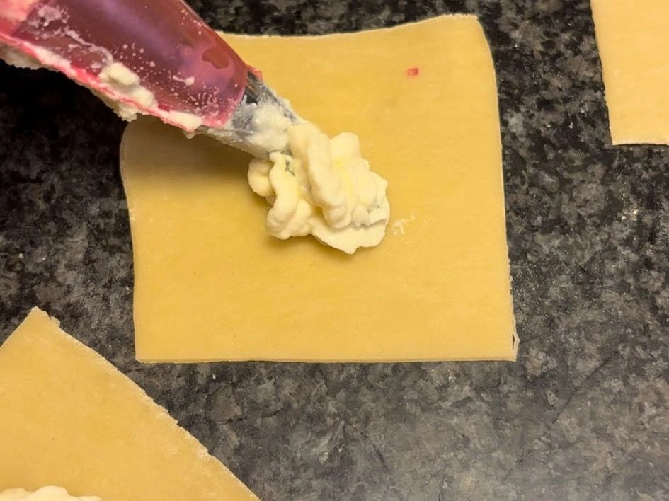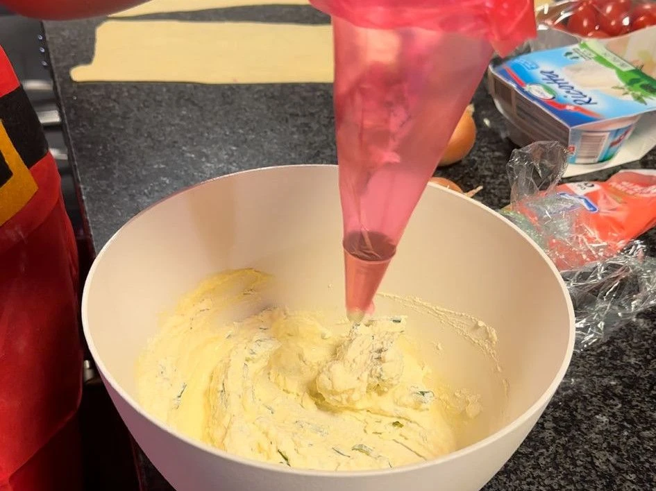 Zutaten der Füllung miteinander vermischen, nach Belieben würzen und in einen Spritzbeutel füllen.