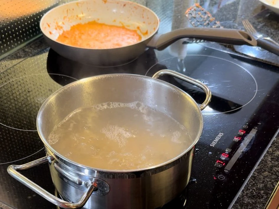 Für die Sauce Zwiebel klein Schneiden, im Olivenöl anbraten und Tomatenmark beigeben. Die Cherrytomaten halbieren und dazugeben, mitdünsten. Mit Wasser ablöschen und einköcheln lassen. Sauce mit dem Stabmixer pürieren, Rahm dazugeben und abschmecken.