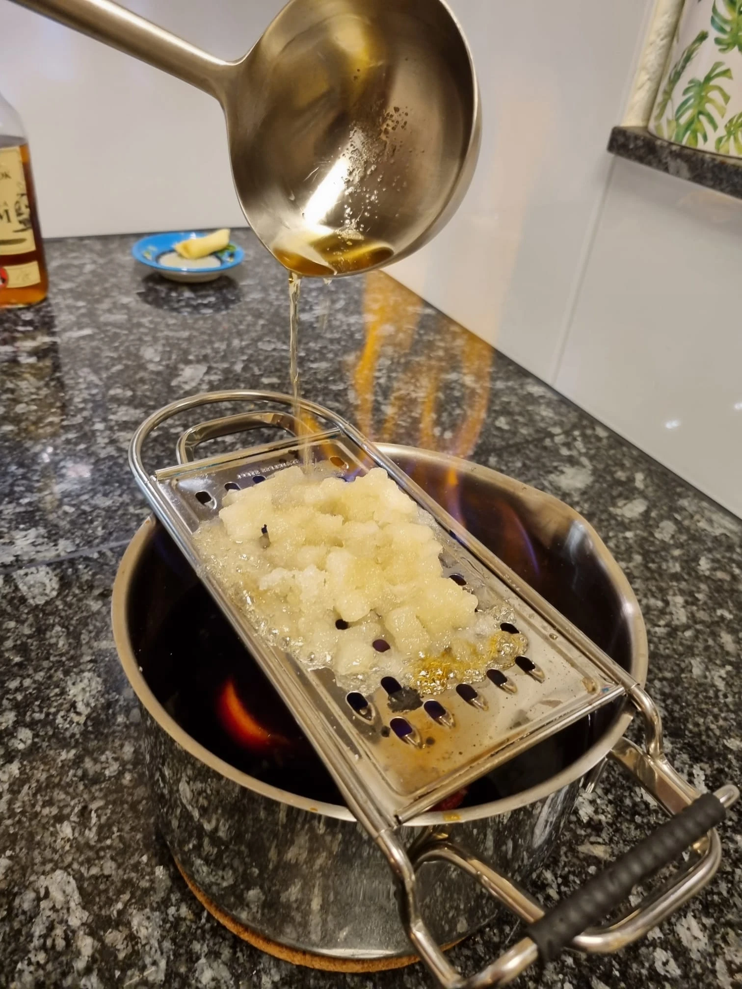 Restlichen Rum zunächst in die Kelle gießen, dann über den brennenden Zucker laufen lassen. (Nie mit der Rumflasche direkt an die offene Flamme gehen!)