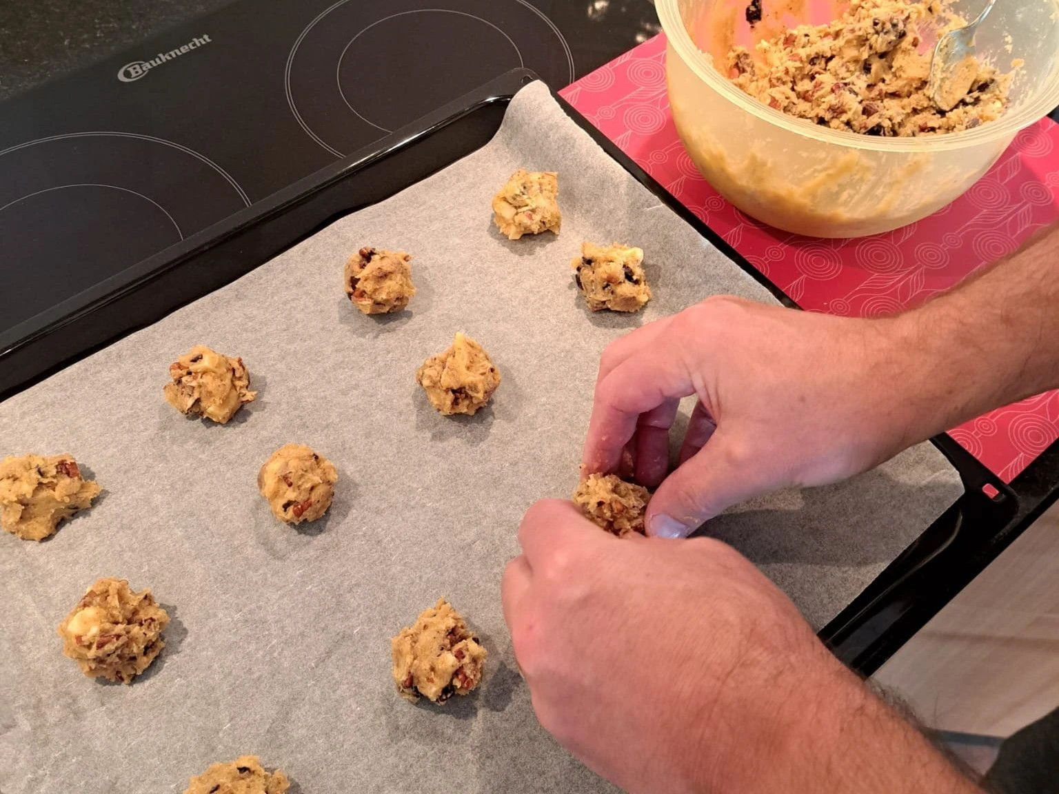 Zum Schluss Pekannüsse und Schokoladenstücke darunter rühren.