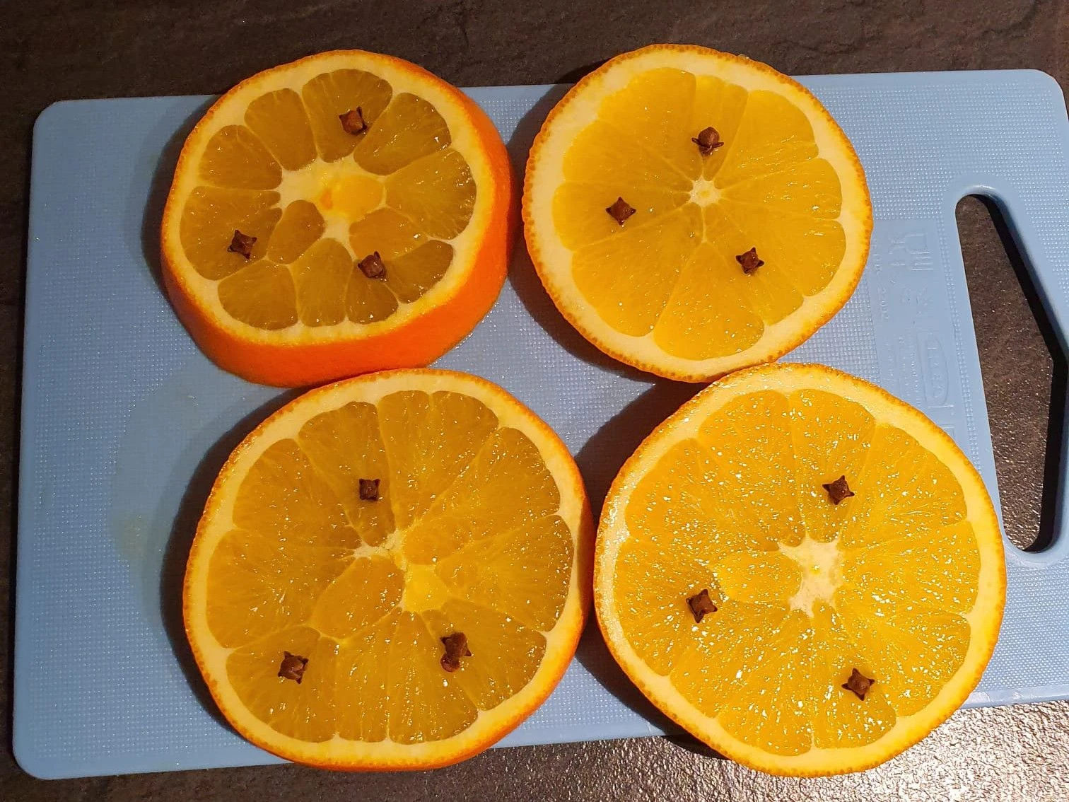 1.Schritt: Apfelsaft in einen grossen Topf geben. Die Orangen in 1-2 cm dicke Scheiben schneiden und je 2-3 Nelken in die Scheiben stecken.