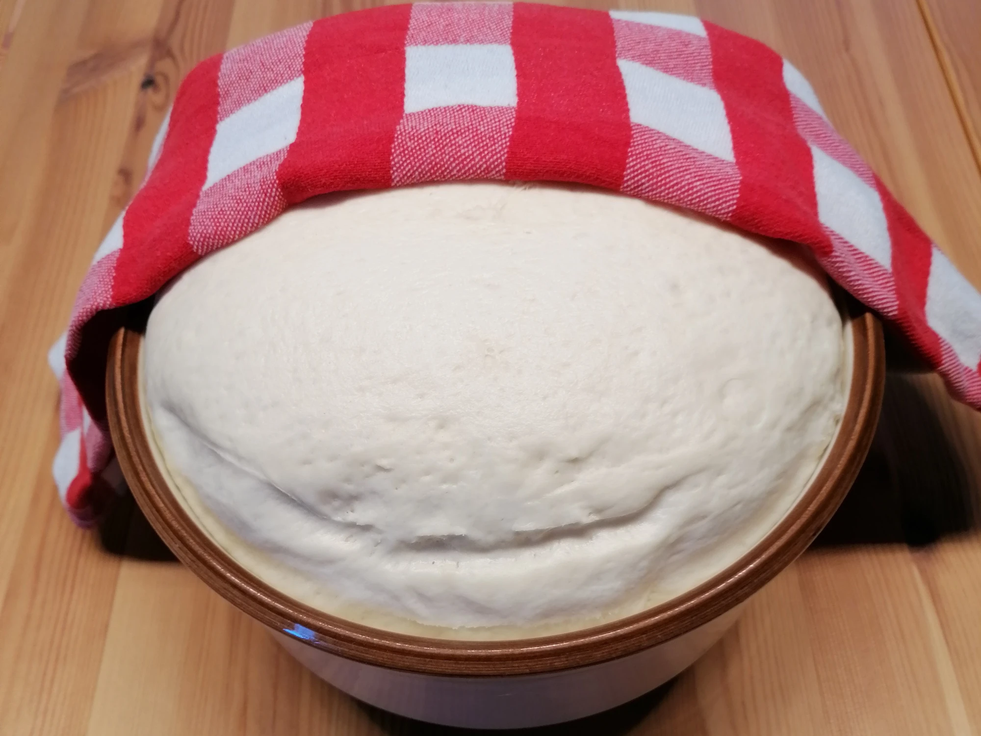 Die erwärmte Flüssigkeit unter das Mehl rühren, bis ein weicher, glatter Teig entsteht. Teig mit nassem Tuch zudecken und bei Raumtemperatur ca. um das Doppelte aufgehen lassen. (ca. 1-2h)