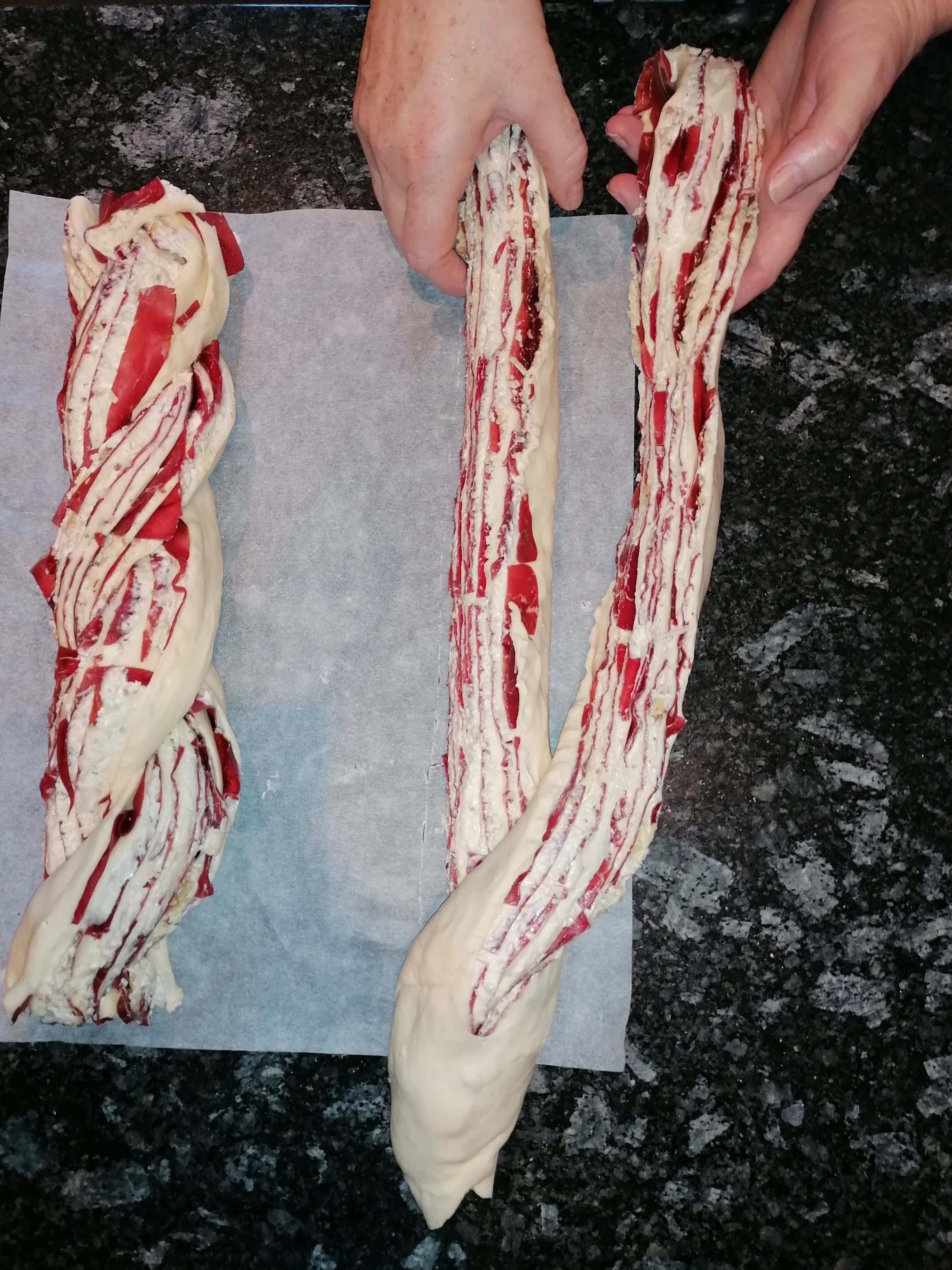 Teig aufrollen, in der Mitte aufschneiden, oben ein kleines Stück nicht trennen, damit die Hälften besser verdreht werden können. Enden abschneiden und auf ein Blech legen.
