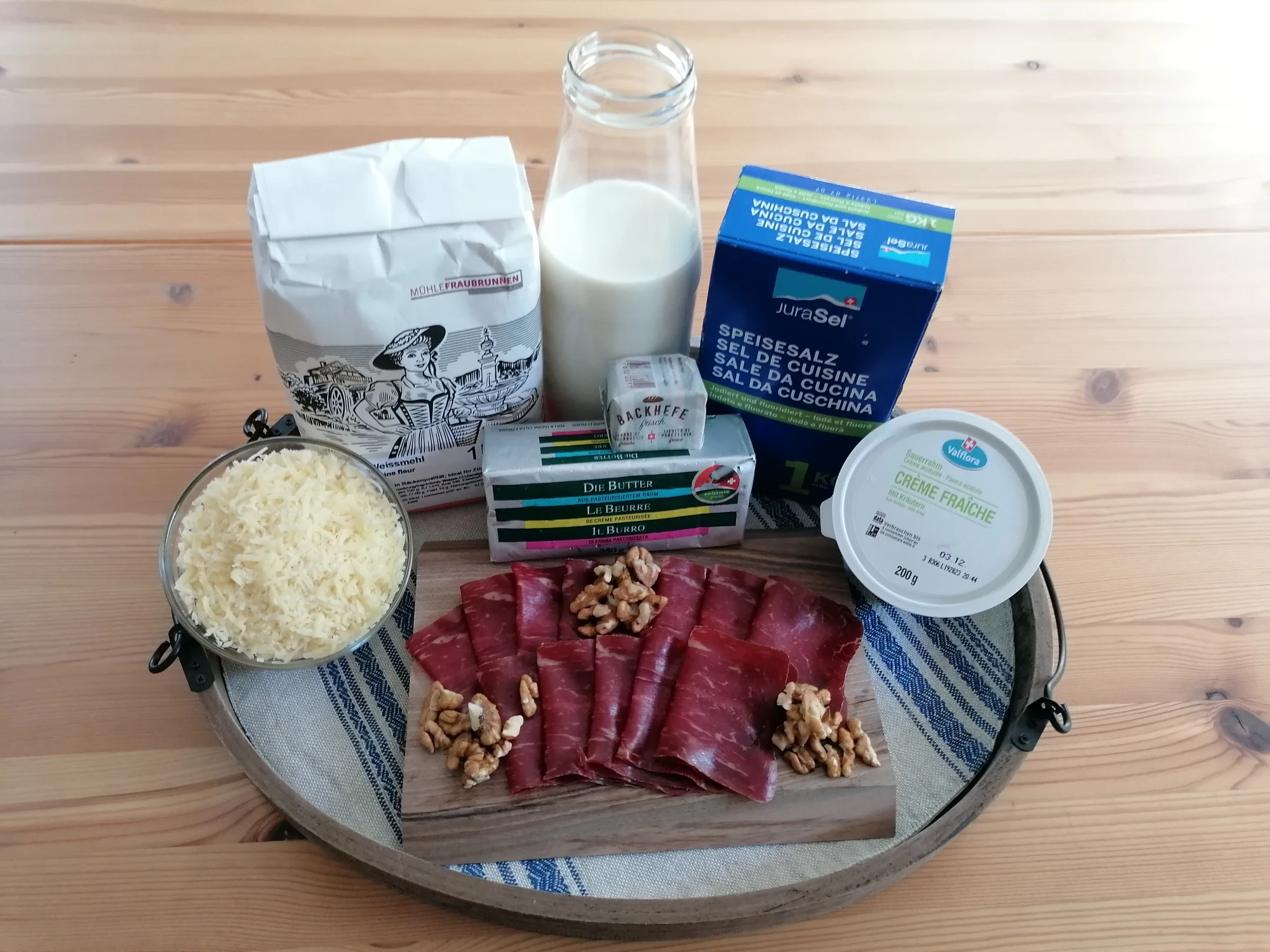 Teig mit Crème Fraîche bestreichen, anschliessend Reibkäse und die gehackten Baumnüsse darauf verteilen. Die Bündnerfleisch Tranchen werden am Schluss noch über alles verteilt.