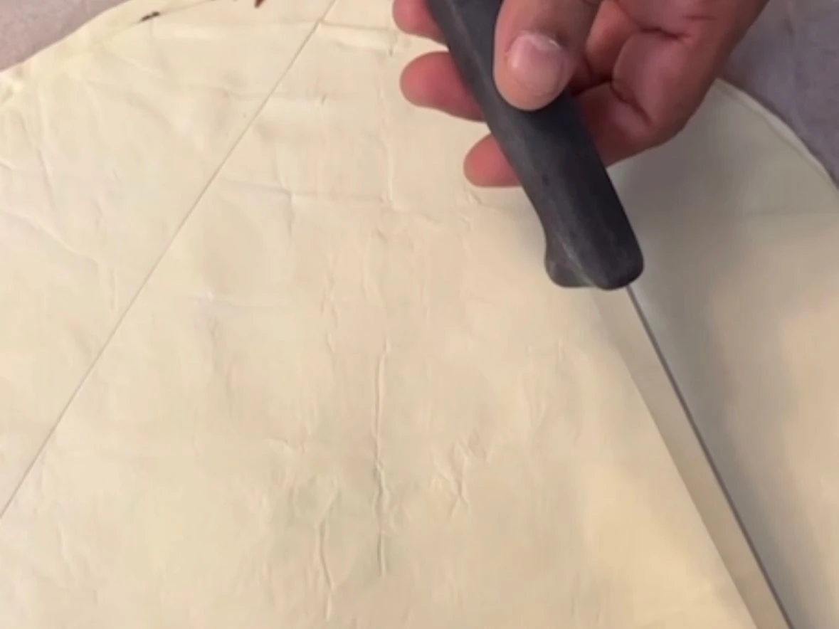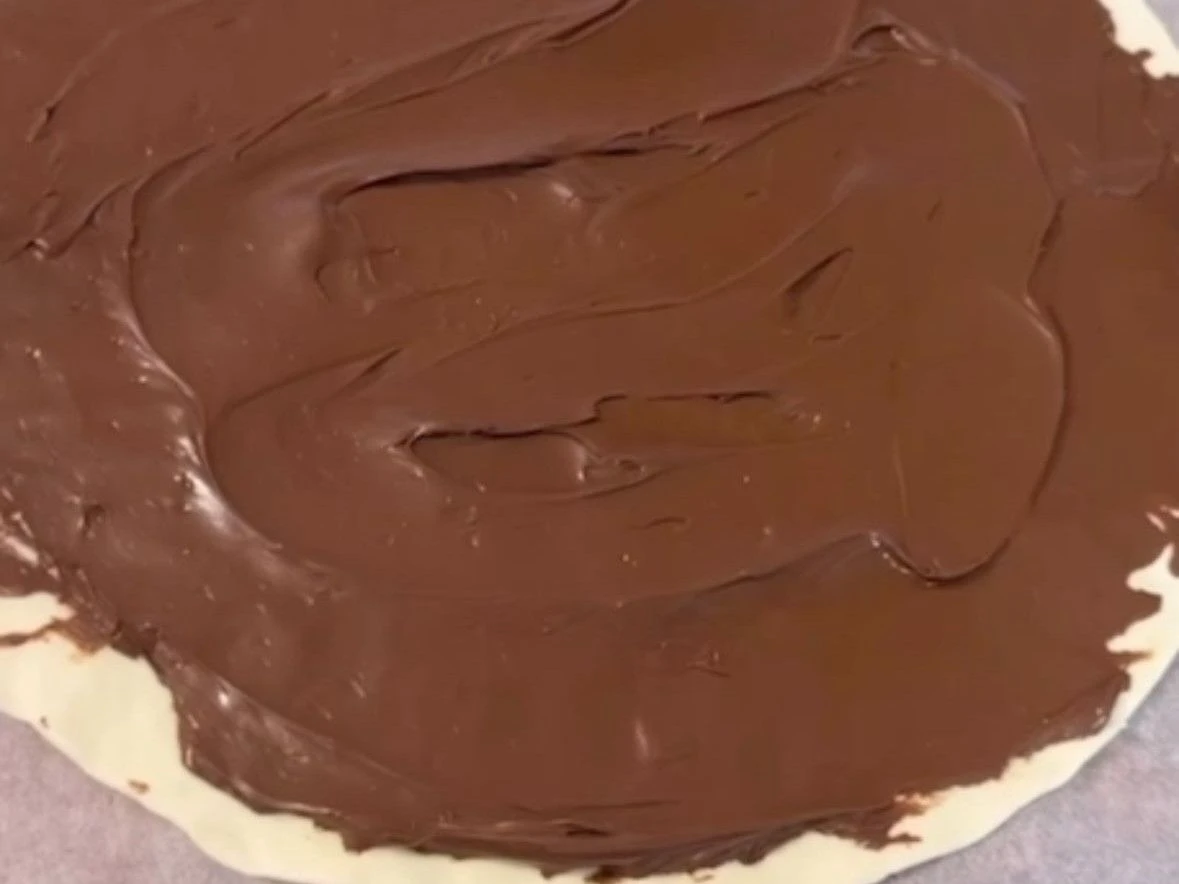 1. Den ersten Blätterteig auf einem Backpapier auseinanderrollen und vollständig mit Nutella bestreichen. Den zweiten Blätterteig auseinanderrollen und auf den bestrichenen Blätterteig legen.