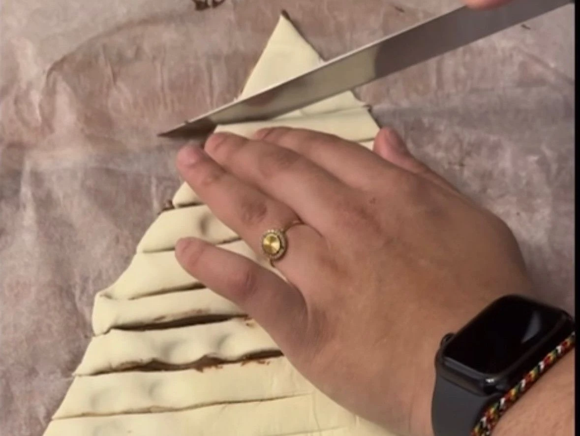 3. Den Ofen auf 200 Grad vorheizen. Beide Tannen-Seiten in breite Streifen schneiden. Dabei in der Mitte Platz lassen und die obere Spitze auslassen. Den Tannenbaum mit Hilfe des Backpapiers auf ein Blech ziehen.