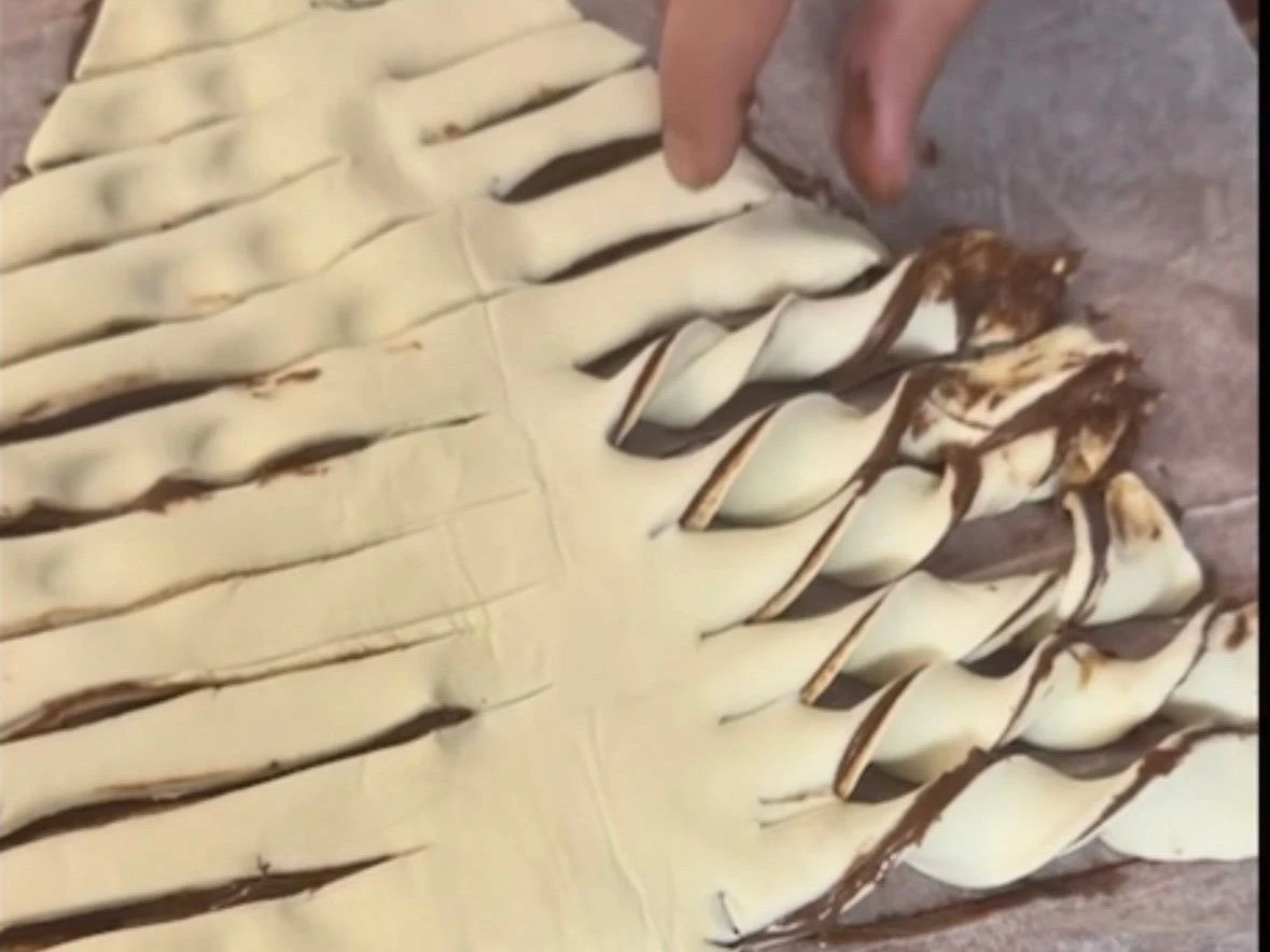 4. Die Streifen nun in sich drehen und wieder ablegen. Ei mit der Milch mischen und den Tannenbaum mit der Mischung einstreichen.