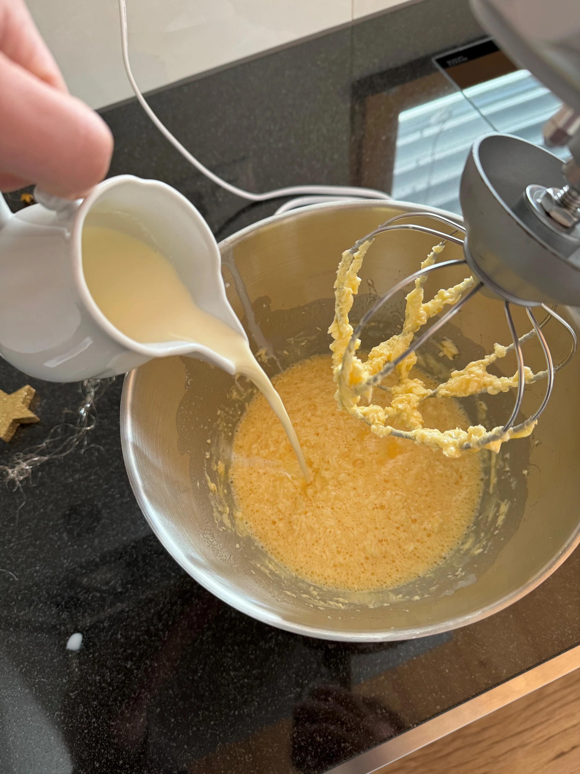 Zucker, Eier und Rahm zugeben, rühren, bis die Masse hell ist.