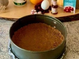 2. Für den Boden die Spekulatius mahlen, sodass sie sehr fein sind. Butter schmelzen und mit den Spekulatius mischen. Auf den Boden geben und mit Hilfe eines Löffels gut andrücken. Beiseite stellen.