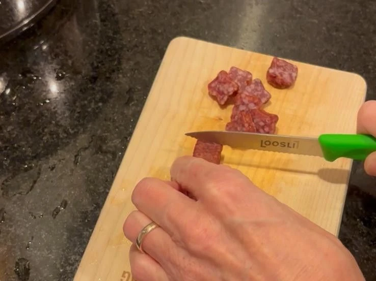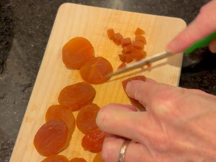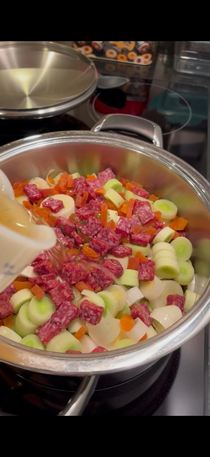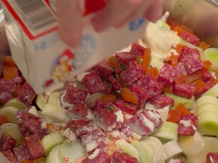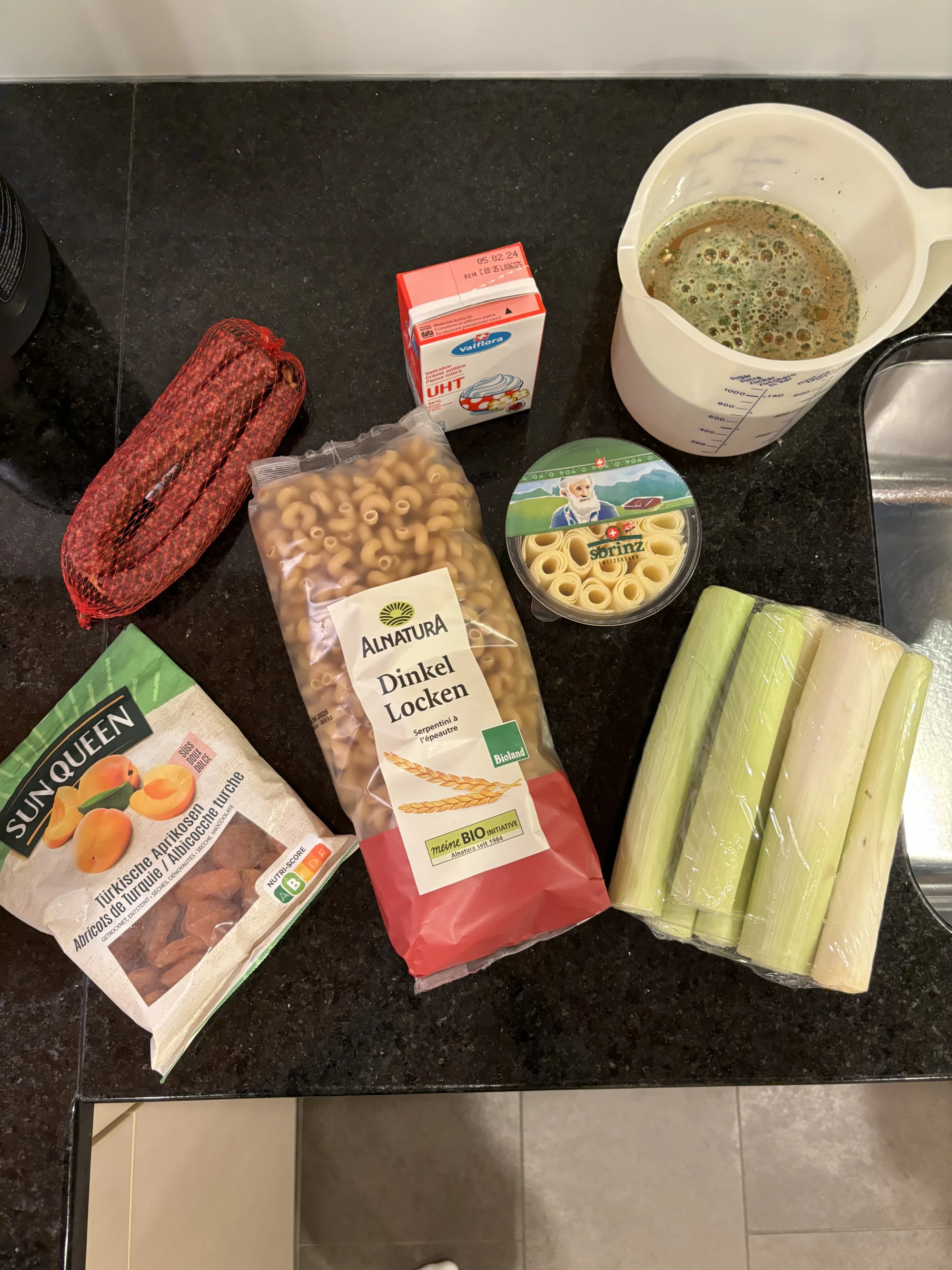 Lauch in ca. 5 mm dicke Ringe, Landjäger in feine Scheiben schneiden. Dörraprikosen in Würfeli schneiden.