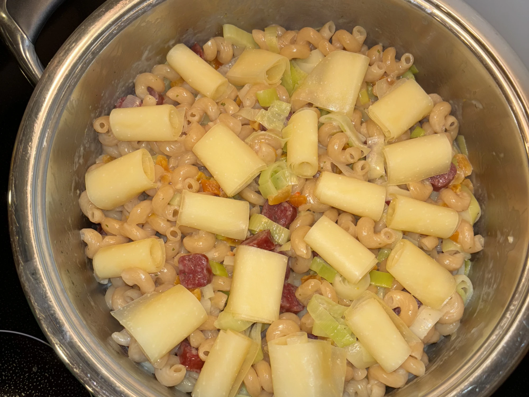Teigwaren, Lauch, Landjäger und Aprikosen in eine grosse Pfanne geben. Rahm und Bouillon dazugiessen, mischen, aufkochen. Zugedeckt unter gelegentlichem Rühren bei mittlerer Hitze ca. 10 Min kochen, bis die Teigwaren al dente sind.